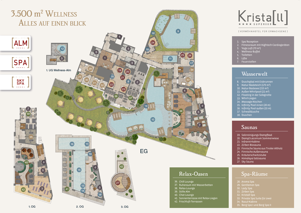 Whether you prefer a morning swim, daydreaming in one of our relaxation lounges, or an evening sauna on Tuesday: Here you can find at a glance when our Kristall SPA, the Wellness-Alm, the new Sky Spa, the swimming ponds, and the outdoor whirlpool are open for you.